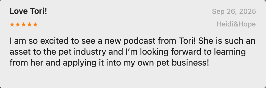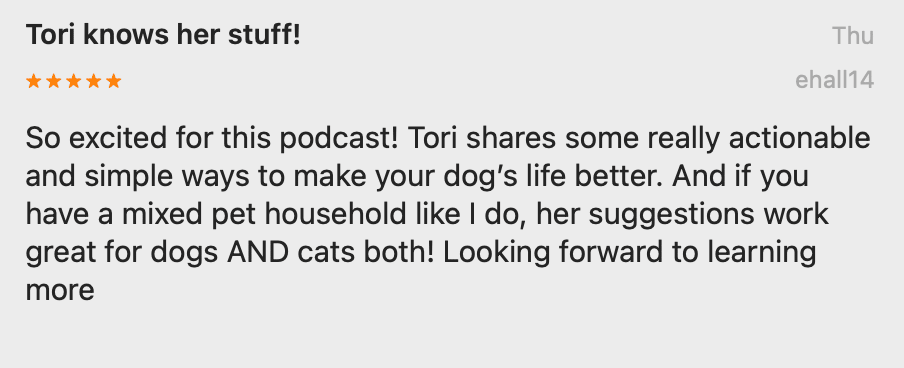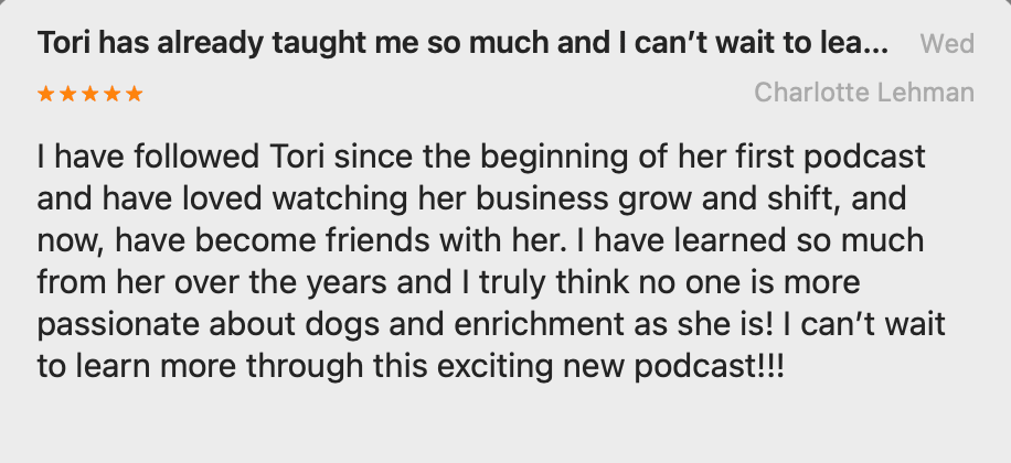 Hi [FORMATTED_FIRST_NAME GOES HERE] - Last week, my new podcast Dog Enrichment with Tori Mistick officially launched 🤩 and I’m so excited to bring you the first deep dive episode today! We’re starting with Mental Enrichment, because puzzles and brain games are what most people think of when they hear “enrichment.” But as I explain in the episode, it’s not just about keeping your dog busy. “The goal of enrichment is NOT to tire out your dog. It’s to give them a better quality of life.” According to several fascinating studies I'll tell you about, mental enrichment helps your dog become more adaptable, less anxious, and generally more optimistic about life. In this episode, you’ll also hear about: If you want your pup to be happier, sharper, and more relaxed, you’ll love this one. 🎧 Listen now → Ep. 2: Boost Your Dog's Brainpower with Cognitive Enrichment I got a little silly making the thumbnail for this episode! Learning about what dogs of all ages are capable of learning got me excited 🤪 Find Episode 2 where you get your podcasts: Thank you for supporting this brand new show. I'm really happy to put something out there that honors Lucy's legacy and all the fun we had making the most of every day together. xo Tori + Burt P.S. Reviews and ratings when a show first comes out could help me get featured in Apple’s New & Noteworthy section. If you listen and leave a review today, you’re not just helping me, you’re helping enrichment reach more dogs around the world. Thank you to those who already left a review on Apple Podcasts - Emily, Charlotte and Heidi! You're the BEST! 🙌🏽 🙌🏽 🙌🏽 |